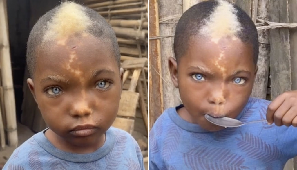 Black boy with natural blue eyes, white hairs and lightning mark down his face goes viral because of his striking features